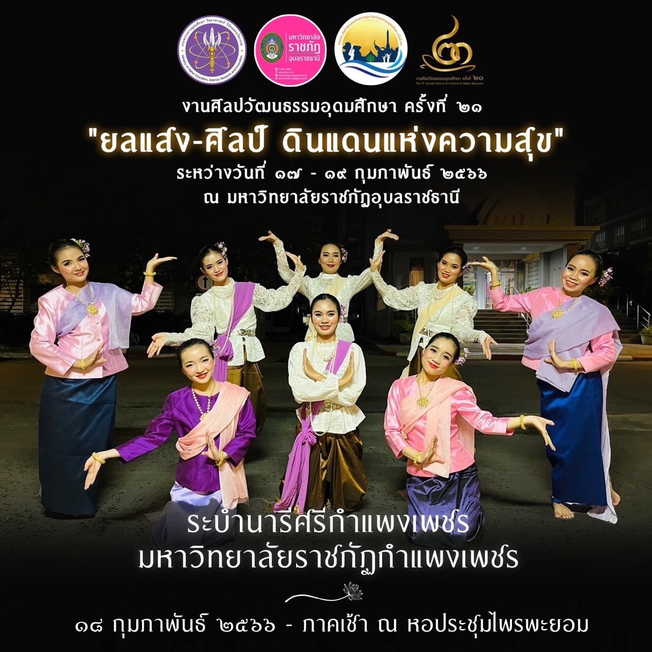 ตัวแทนนักศึกษาสาขาวิชาการประถมศึกษา คณะครุศาสตร์ มหาวิทยาลัยราชภัฏกำแพงเพชร ดังรายชื่อ 1. นางสาวนิตยา ไพรพิริยา 2.นางสาวตรีทิพย์ สุจาริยาชีพ 3.นางสาวพลอย พนวาสากุล 4.นางสาวกัณฐิกา ตูมขาม 5.นางสาววิไลวรรณ เหลือสุขโสภณ 6.นางสาวนงนุช อาภากมล 7.นางสาวนุษบา ธวัชชัยพันธ์ 8.นางสาวมาลี แซ่ย้าง 9.นางสาวกรองทอง คงคาทองผกา 10.นางสาวดวงกมล พนาก่อเงิน และ 11.นางสาวดรุณี อาชาวินัย โดยการแสดงประกอบด้วยชุดการแสดง คือ ระบำชากังราว และนารีศรีกำแพง