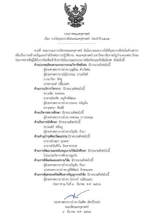 เนื่องในงานปัจฉิมนิเทศและมอบประกาศเกียรติบัตรสำหรับนักศึกษาที่สำเร็จการศึกษา ปีการศึกษา 2565 ของนักศึกษาหลักสูตรครุศาสตรบัณฑิต และหนึ่งในกิจกรรมมีการมอบรางวัลให้กับบุคคลกรดีเด่นในด้้านต่างๆ ให้กับคณาจารย์และเจ้าหน้าที่ จากผลงานการปฏิบัติงานด้านต่างๆ เมื่อวันที่ 10 มีนาคม 2566