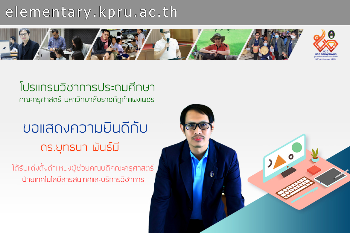 โปรแกรมวิชาการประถมศึกษา ขอแสดงความยินดีกับ ดร.ยุทธนา พันธ์มี ในโอกาสได้รับแต่งตั้งตำแหน่ง "ผู้ช่วยคณบดีฝ่ายเทคโนโลยีสารสนเทศและบริการวิชาการ"