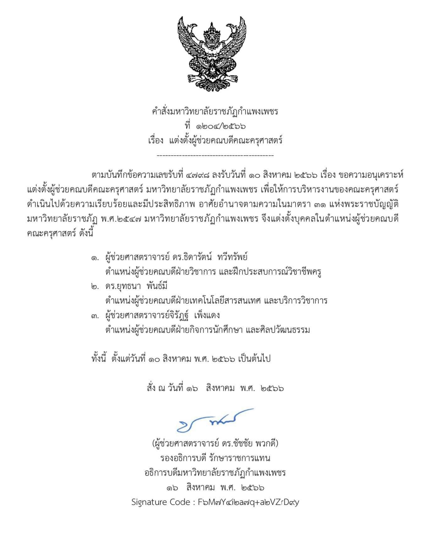 จากการประชุมคณะกรรมการประจำคณะครุศาสตร์ เมื่อวันที่ 9 สิงหาคม 2566 มีมติแต่งตั้ง ดร.ยุทธนา พันธ์มี อาจารย์ประจำโปรแกรมวิชาการประถมศึกษา ให้ได้รับตำแหน่งผู้ช่วยคณบดีคณะครุศาสตร์ ฝ่ายเทคโนโลยีสารสนเทศและบริการวิชาการ อันเป็นส่วนหนึ่งของการทำงานเพื่อพัฒนาด้านเทคโนโลยีสารสนเทศ และงารบริการวิชาการ คณะครุศาสตร์ ที่มีเป้าหมายร่วมกันกับคณาจารย์ นักศึกษา และบุคลากรประจำคณะฯ ตามพันธกิจของมหาวิทยาลัยราชภัฏกำแพงเพชร