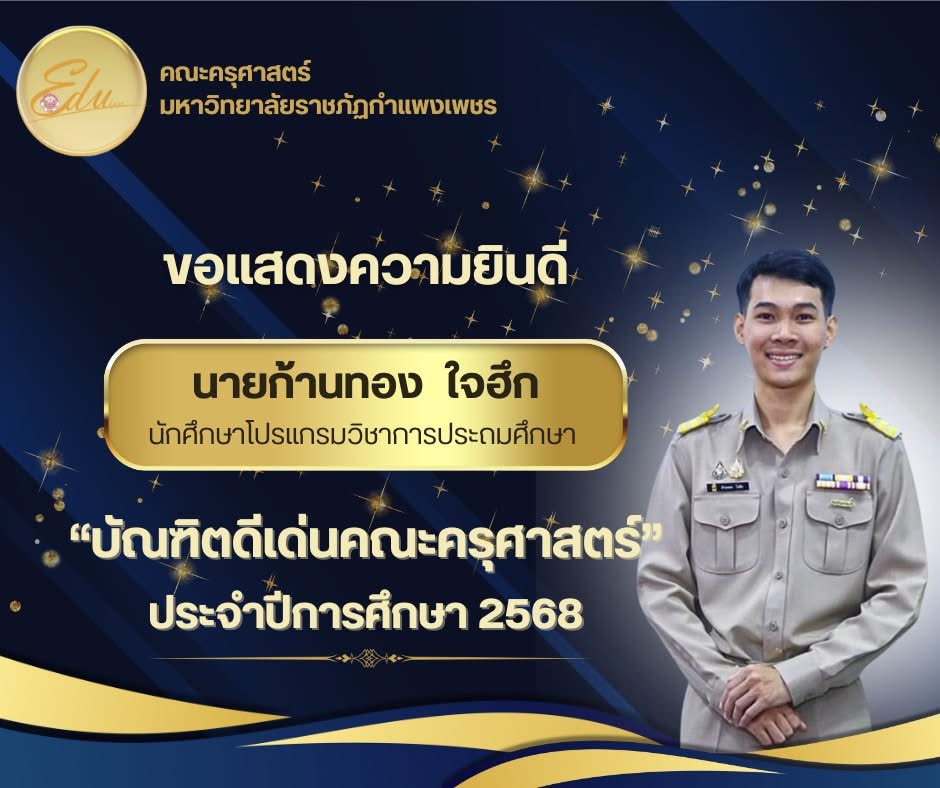 โปรแกรมวิชาการประถมศึกษา คณะครุศาสตร์ มหาวิทยาลัยราชภัฏกำแพงเพชร ขอแสดงความยินดีกับศิษย์เก่า รหัส 63 คุณครูก้านทอง ใจฮึก เนื่องในโอกาสได้รับเลือกเป็นบัณฑิตดีเด่น ประจำปีการศึกษา 2566